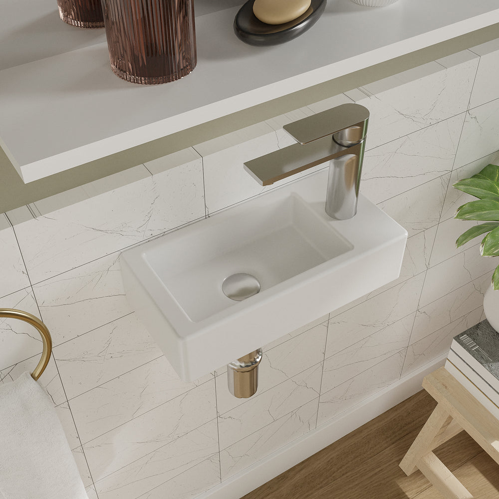 An easy-to-install wall mount sink (drain assembly and waste are not included);